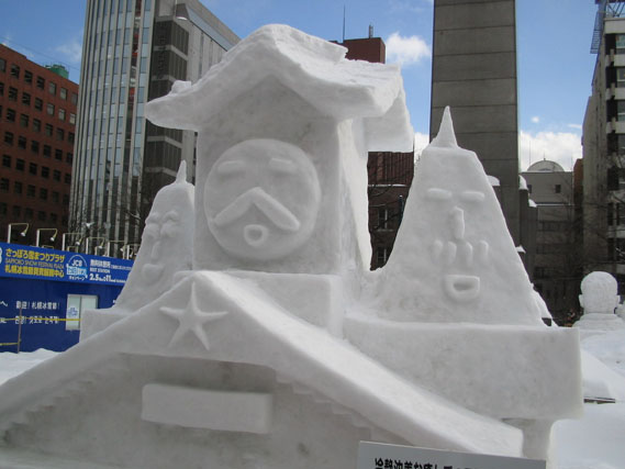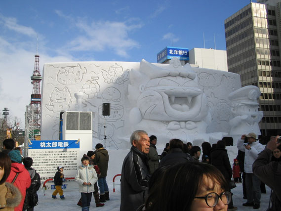 市民雪像コーナーの中で謎だったのがこれである。最初2ちゃんねるキャラかと思っていたけれども、実はどうもなめ猫なのではないかという説が出てきた。