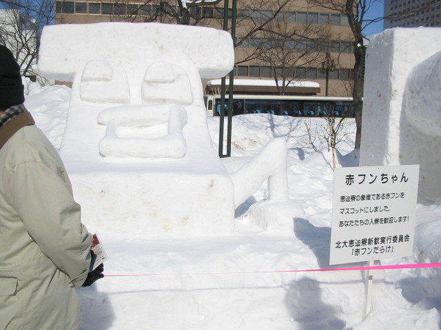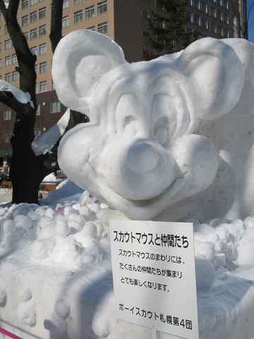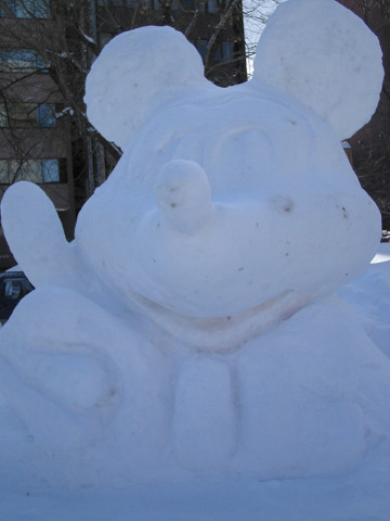 途中、既に見てきておった吉野氏が「関白、こんな問題のある雪像があります」と言って見せてくれたものがあった(写真1、写真2)。子供の書いたミッキーでさえも消させるディズニー、○が3つ、適当な配置で置かれていても権利を主張するディズニー、であるからしてこのようなものにまでクレームが付かぬとは言えぬが、まぁもう最終日近いしバックレておっても問題ないであろう。
