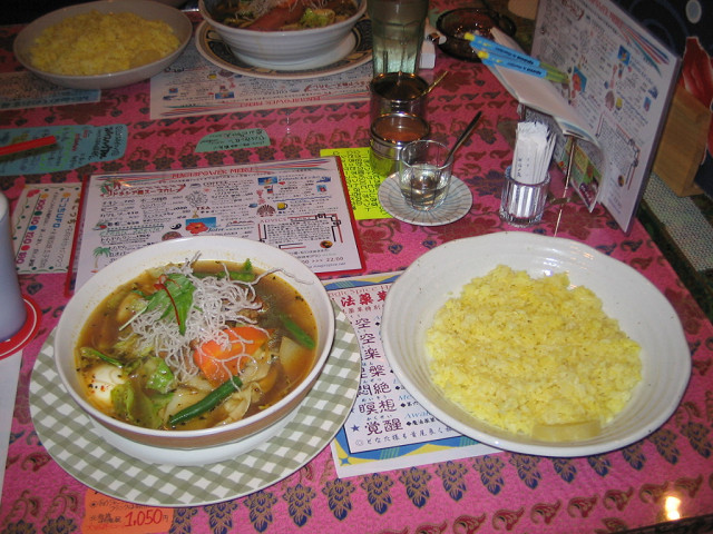 サフランライスをスプーンに取り、スープカレーの中に浸して喰うのが正式な食い方らしいが、スープもなかなか具だくさんである。一見野菜の煮炊きのようにも見える。