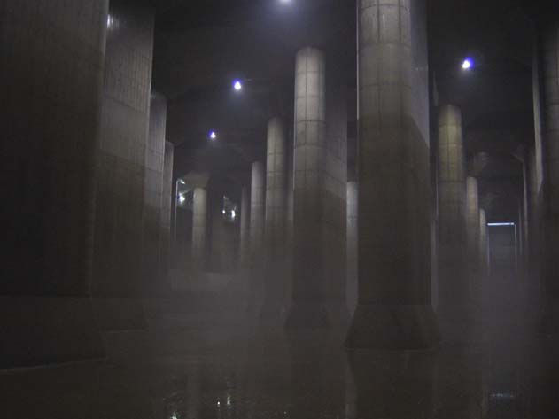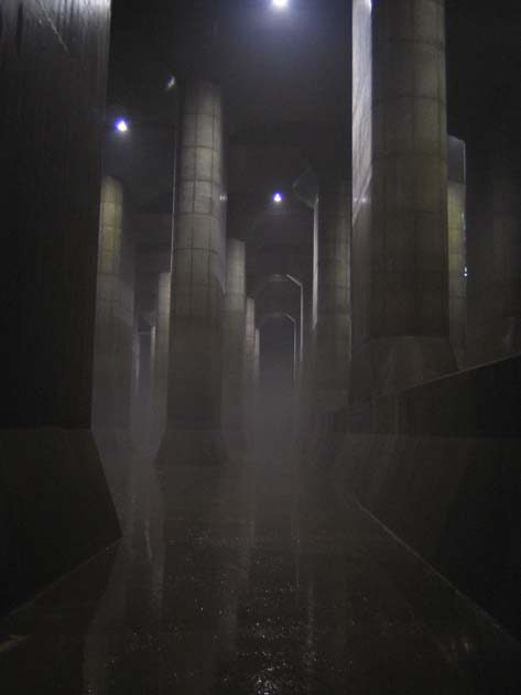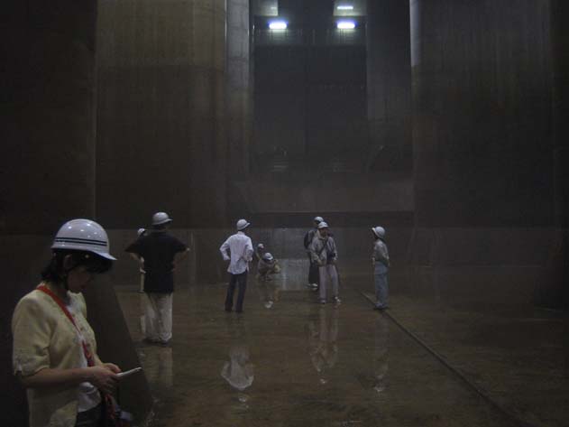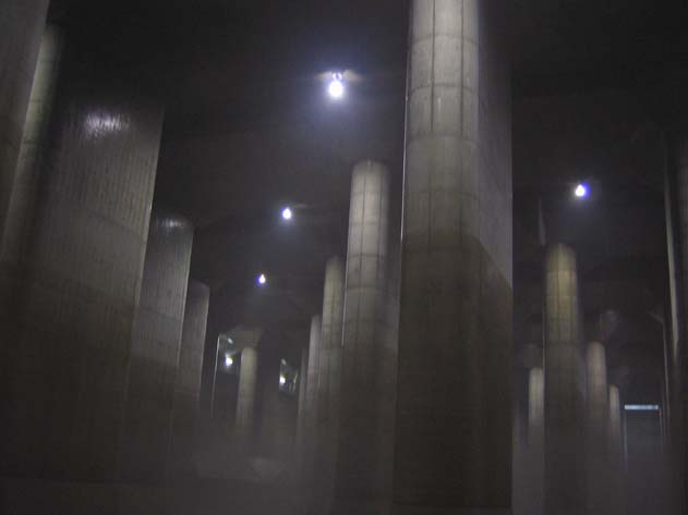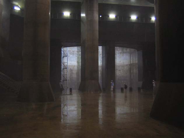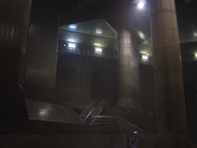 この写真の遠方に見える吹き抜けのようなものは「立抗」と呼ばれる円柱型の巨大な穴であり、付近の余剰な水を貯水する為のものである。大きさはスペースシャトルや自由の女神がすっぽり入ってしまうという。