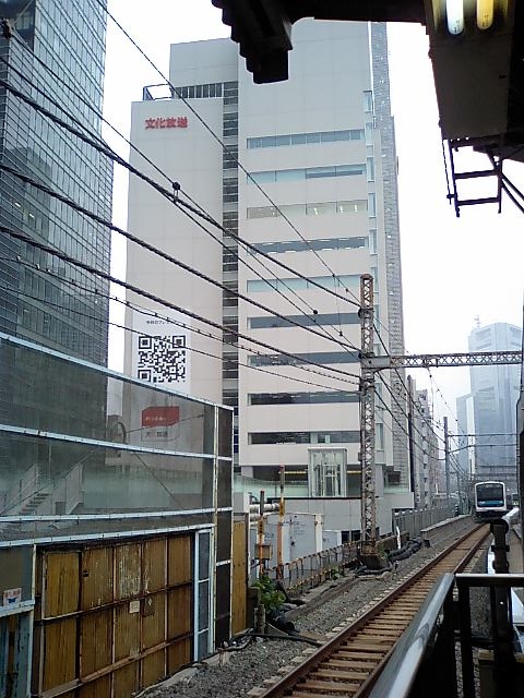 駅のホームからは電線が邪魔でうまく撮れなかった為一旦下車する。新しい文化放送は、駅からの陸橋を経て2階が玄関のようじゃ。