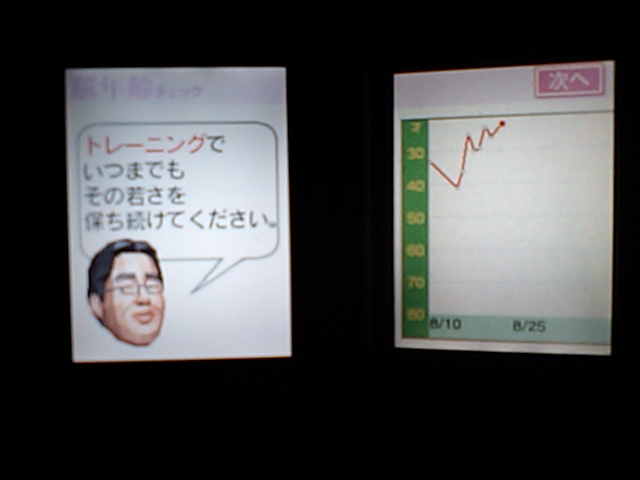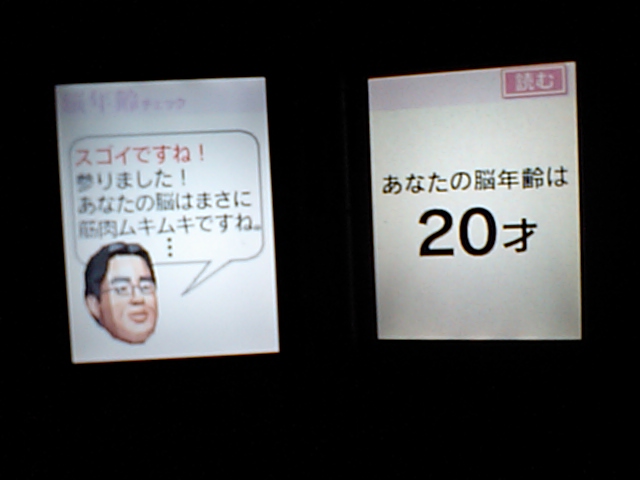 さて昨日も書いた「脳を鍛える大人のDSトレーニング」の件であるが、いや、まぁごく些細な事ではあるのだが、関白においてはこのほど脳年齢20才を達成した(写真1、写真2)。