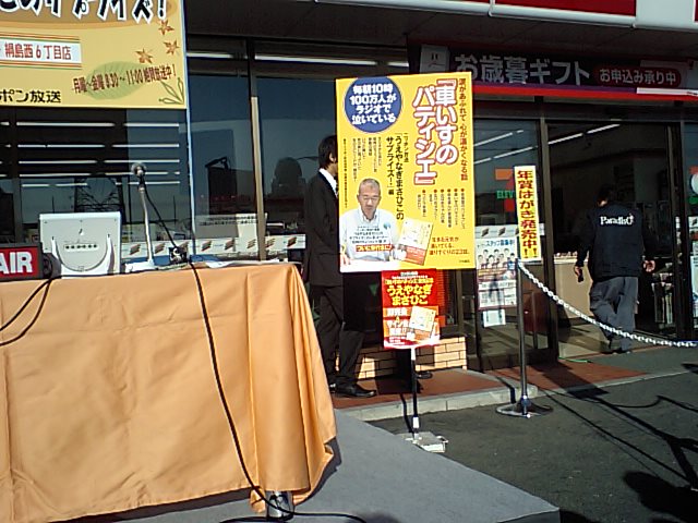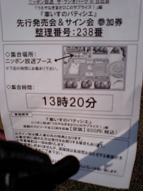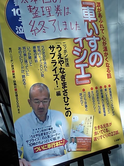 でもって本題である、うえちゃんの公開録音である。9時半頃に到着し、入り口で、今日先行発売される「車椅子のパティシエ」サイン会の入場整理券をもらう。その時点で300冊中の238番であった。サイン会自体は11時半からではあったが、整理券には13時20分に来てくれと書いてある。席の隣の者は197番とかで12時50分であったから、かなり余裕を持って客をさばくつもりなのであろう。しかも今回はうえちゃんのサインは予め本に書かれており、追加で入れてくれるのは名前だけ。おまけに写真撮影も禁止なのである。