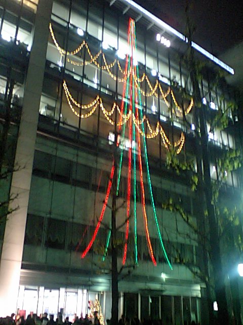 19時半頃のニッポン放送本社はこのような感じで、社屋自体がこのようなデコレーションを施されておった。