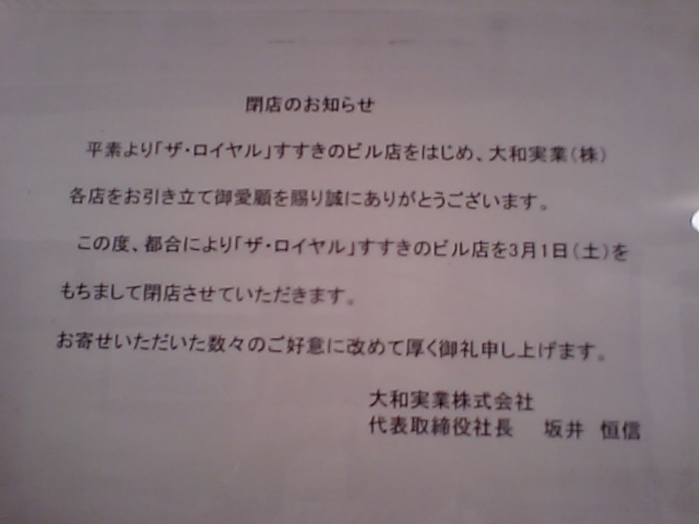 このビルの系列店、アジアンキッチンとかも既に閉店しておるので、ロイヤルが最後の店舗のようである。しかしステータスクラブであるエスカイヤクラブだけは残るようで、それくらいなら別に他店も潰す必要はなかったのではなかろうか。
