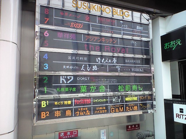 折角なので店の前を通る。これはすすきのビル店の案内看板であるが、ロイヤル以外の店舗はもう先に閉まっておる。そしてこの看板に、もう灯が灯る事はないのである。