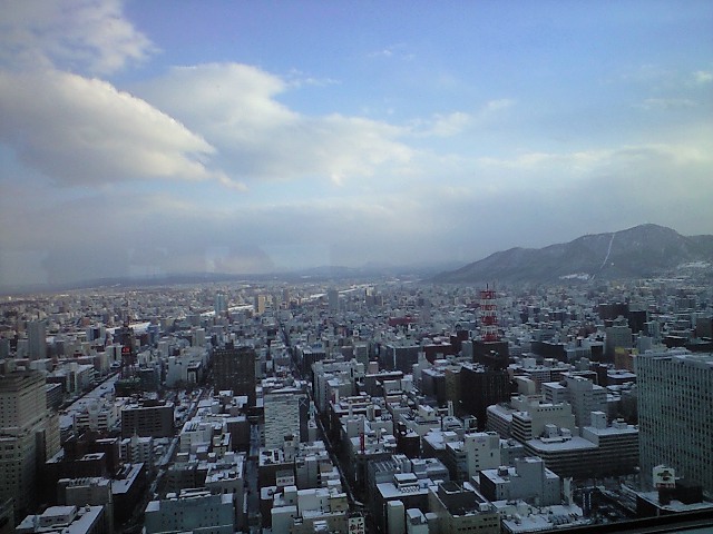 そして昼はまたサッポロファクトリーに赴き、今度は時間があるのですき焼きセットを頼む。ちょっとお土産を見た後、札幌駅隣接のソフトバンクショップで、プリペイド携帯のUSIMカードだけを入手する事にする。FAXで登録するので時間がかかるらしい。この隙に近隣のスパでも行こうかと思ったけれども、どうも時間が微妙じゃった。であるからビックカメラ、その上のゲーセン、と見物し、ついでにJRタワーへも上がってみる。2年ぶりの展望室からの光景はこんな感じであった。