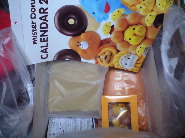 外側はこんな感じで、中はこんなである。カレンダー、ブランケットのようなもの(2つ)、土鍋かキャンディーポットのようなもの、ポンデライオンの貯金箱、ストラップ、そしてドーナッツただ券15枚分、ドーナッツ10個まで20%割引券6枚、という構成であった。
