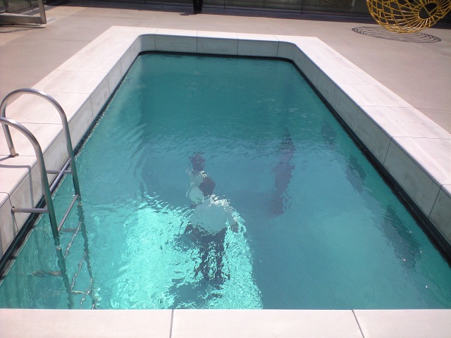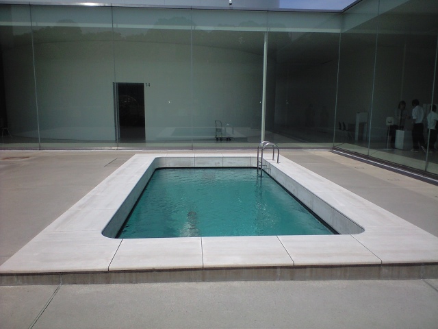 塩で作った枯山水のような展示。ここは現代アート専門というか、建物の一部、建築物のレベルに達する大きなものが作られておる、意外にスケールの大きな美術館である。そして次は、テレビにここが紹介される際はまず間違いなく登場する「プール」である。見ての通りガラスがはめられており、下から覗く事もできる。
