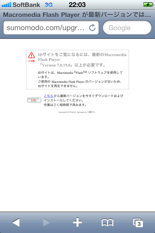 スマートフォンの多くやiPadで見てもこうなるであろう。しかも指摘しておるように「Flashのバージョンが古い」のではなく、そもそもFlashは入らんのじゃ。昔であれば閲覧環境もPCが多く、また対応サイトの少なさやFlash自身の重たさでFlashを入れておらぬ者は多かったろうが、近年ほぼ標準化されたと言ってもいいところまできた。Flashのみに対応するのはそれが故であろうけれども、閲覧環境の変化により今やその情勢も変わってきた。
