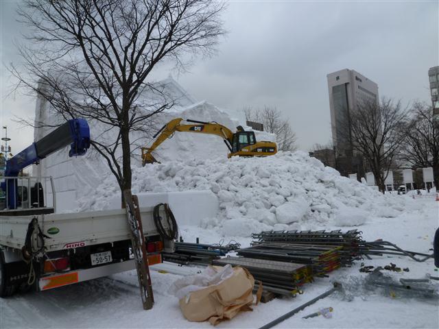 本日の最初の予定は13時半。某社への訪問であるが、できればその前に、新さっぽろでこの日まで展示されておったはやぶさのカプセルでも見に行きたかった。しかし時間がない。せめて大通公園の雪像が壊されているところでも見に行こう。..という訳で、これがサザエさんの雪像の残骸である。波平の頭にショベルが入ると見物客から声が上がったと聞くが、昨今はそういう雪像破壊見学ツアーもあるようなのである。