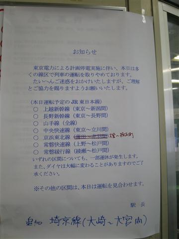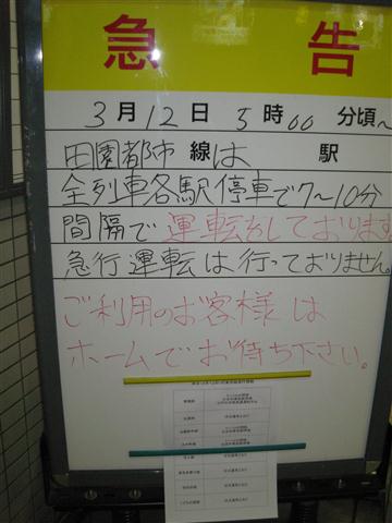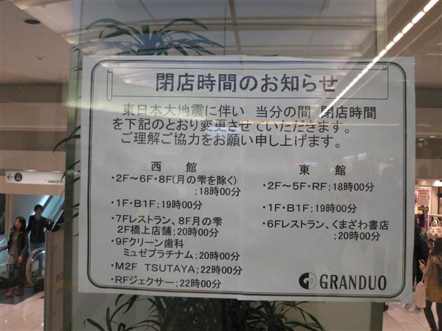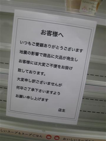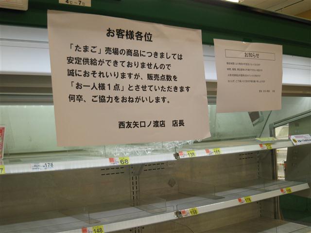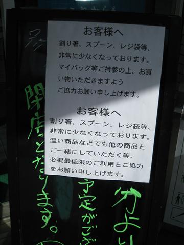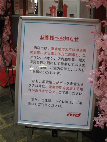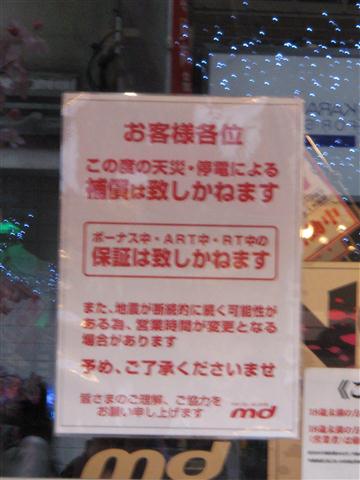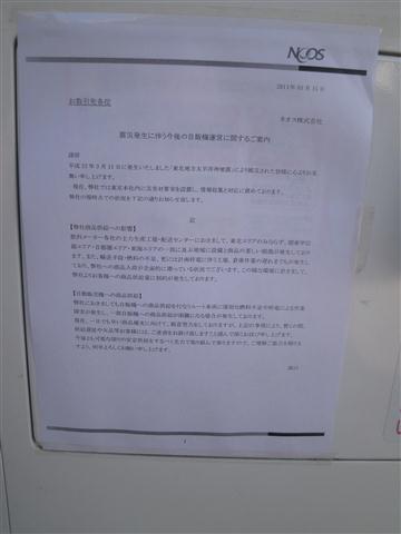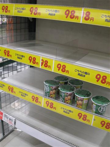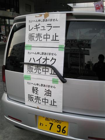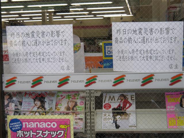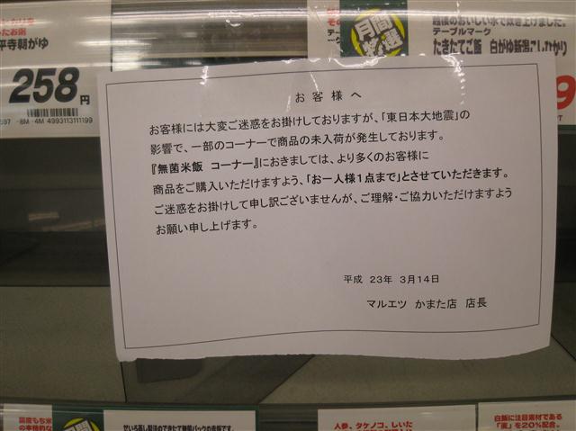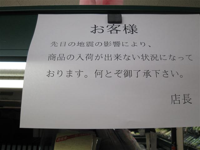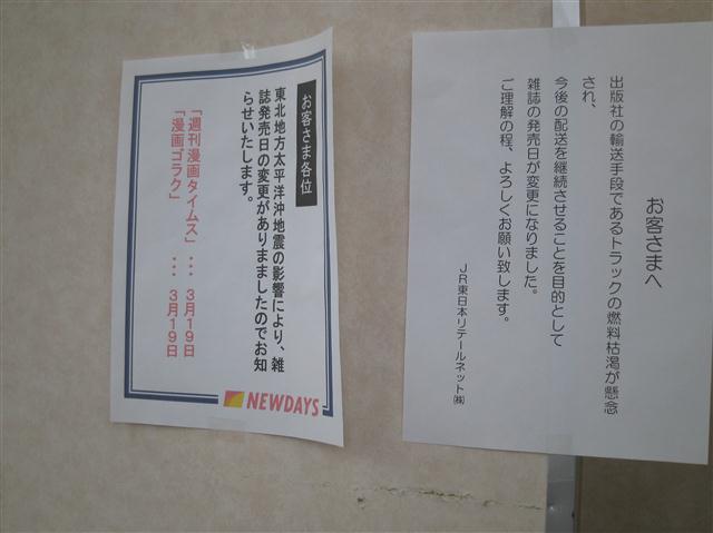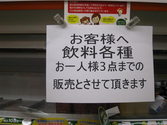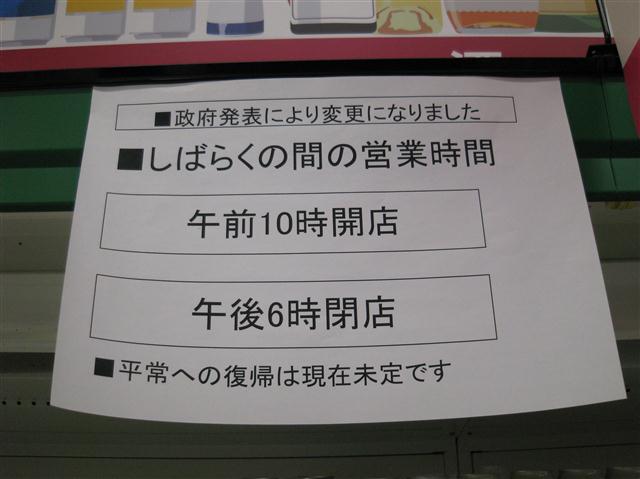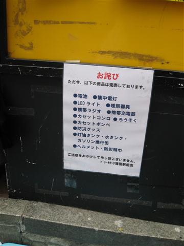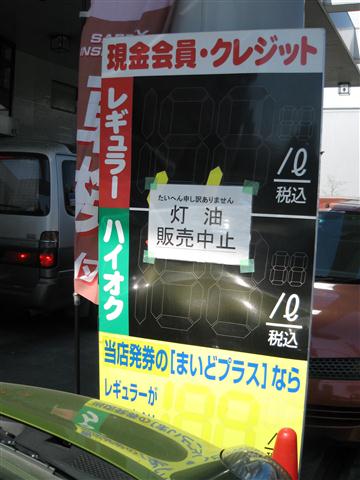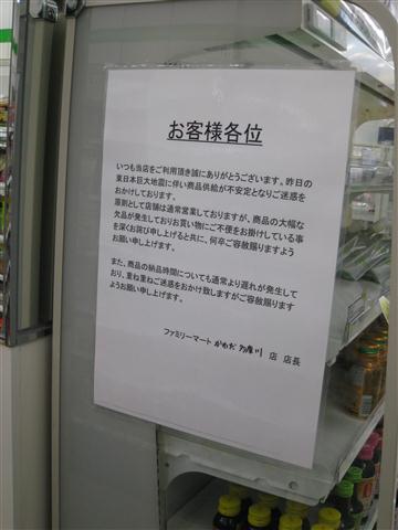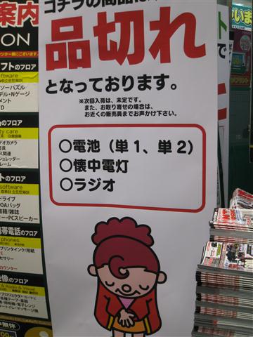 元々需要量が少ない故、こういう事があるとすぐなくなってしまうのかも知れぬけれどもな。ちなみに単三単四電池については、都心では値段にうるさく言わなければそれなりに手に入るようにはなった。ガソリンスタンドの行列もなくなり、消えておった料金表示も戻ってきた。まだまだコンビニなどの棚は引くくらい空きが目立つが、復興が進んでおるようで幸いである。