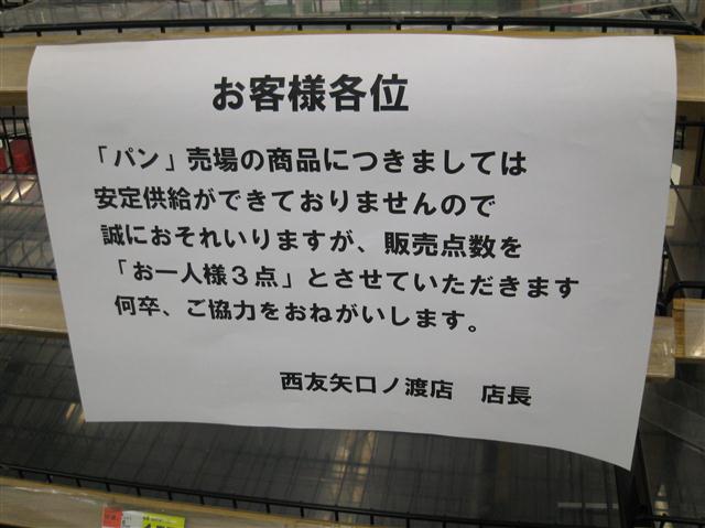 先日であれば買うのに行列が出来た米類も、姿を見かけなかったレトルトパック米も、潤沢と言わないまでも見るようにはなった。水の汚染が言われるようになったからかまた水を見なくなったのはアレであるけれども、菓子パン、食パンもあるし、状況はちょっと落ち着いてきたように思える。オマケに駅前のコンビニでは、パンの半額セールまでやっておった。