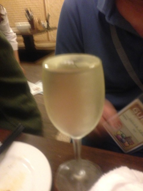 この店でグラスワインを頼むと、テーブルにグラスを持ってきて、このようにすり切り一杯ついでくれるのである。しかも若い娘がとなれば、何度も呼びつけてつがせるのは自然の摂理であろうと言いつつでは関白は帰るぞ。