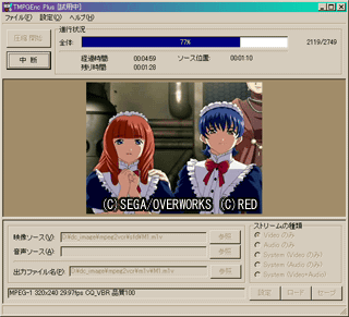V2、Divx v3.11aのlow/fastとDivx v5の2passを使ってみたがDivx v5がオリジナルに近いかな。最初は同じ4.3Mbpsでエンコしたのでかなりオリジナルに近かったんだけど実はファイルサイズが少しオーバーしていたので3.8Mbpsにして調整したら平均化されてしまったように劣化してしまった(爆)。Divxはコーデックをインストールしなくちゃいけないという欠点があるのが痛い。あと重いし。結局結論出ず。(´ー`) どなたか良いMPEG1エンコーダあったら教えてくださぁ〜い。(TДT) |