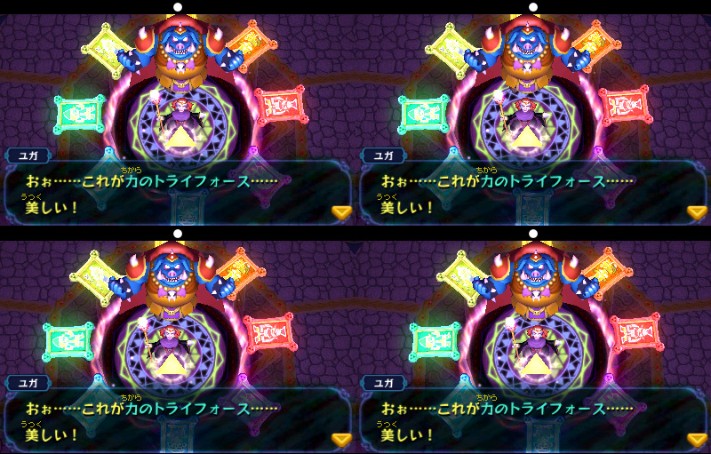 ■ゼルダの伝説 神々のトライフォース2 マスターソードのレベルアップ方法がわかったので、Lv3まで上げて再びガノン戦をやってみると簡単になったので3Dキャプチャーをしました。 ノーダメージで行きたかったけど、雑なプレイになってしまったよ(;´Д`) ※完全にネタバレなので、まだクリアをしていない方はご注意ください。 プロローグのテキストは下画面にのみに表示されていたので、強引に合成。 せっかくなので飛び出すようにしてみたけど、やり過ぎた。見てると疲れるね。 3D映画や3DSは奥行ばかりで、あまり飛び出すようにつくらないのは、そういうことなのかね。 今日はHDRに録画した番組をBDに退避&スクフェス&掃除で終わってしまった。 HDRの空きは出来たけど録画したい番組がかぶりまくりで録画しきれない。 そろそろ3台目が必要か。nasuneで録画した番組をBDに焼けることを知ったのでnasuneという手もあるなぁ |